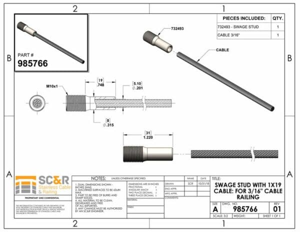 STEEL CABLE RAILING : SWAGE STUD WITH 1X19 3/16″ CABLE