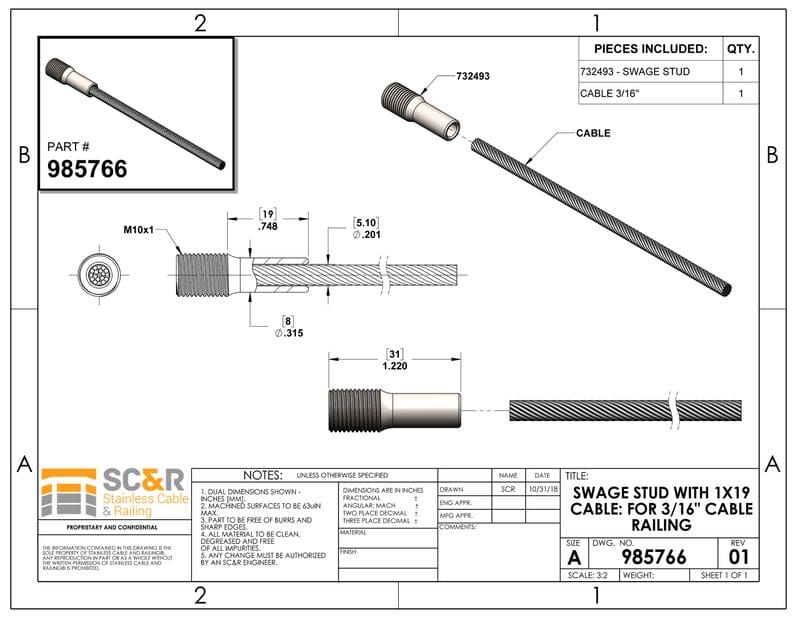 - A SWAGE STUD WITH 1×19 CABLE is “fixed” at one end of the cable by pre-swaging (no charge) at the factory and is not to be swaged by hand in the field. Just order the appropriate cable length. See number “2” in the above drawings to see how the SWAGE STUD is used.
