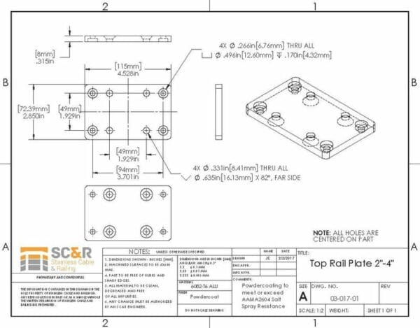 This base plate assembly attaches our Aluminum Posts to a 2×4 Wood Top Rail. Mounts directly to the top of any of our aluminum posts. Use #14 x 1.25″ Phillips Pan Head Screws to attach plate to wood top rail.