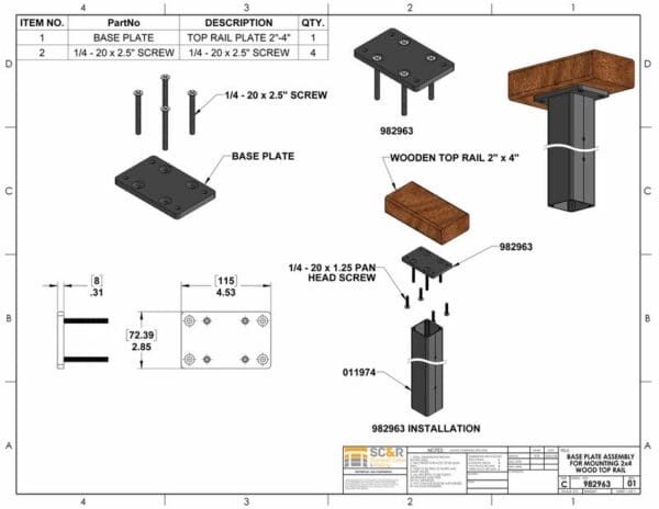 If your wood top rail is 6″ wide, use our 2×6 Base Plate Assembly instead.