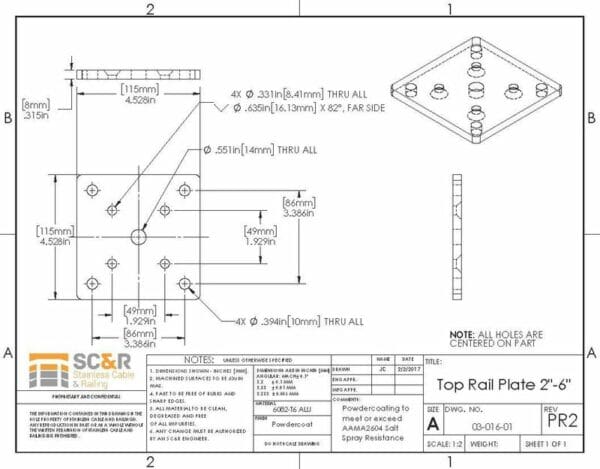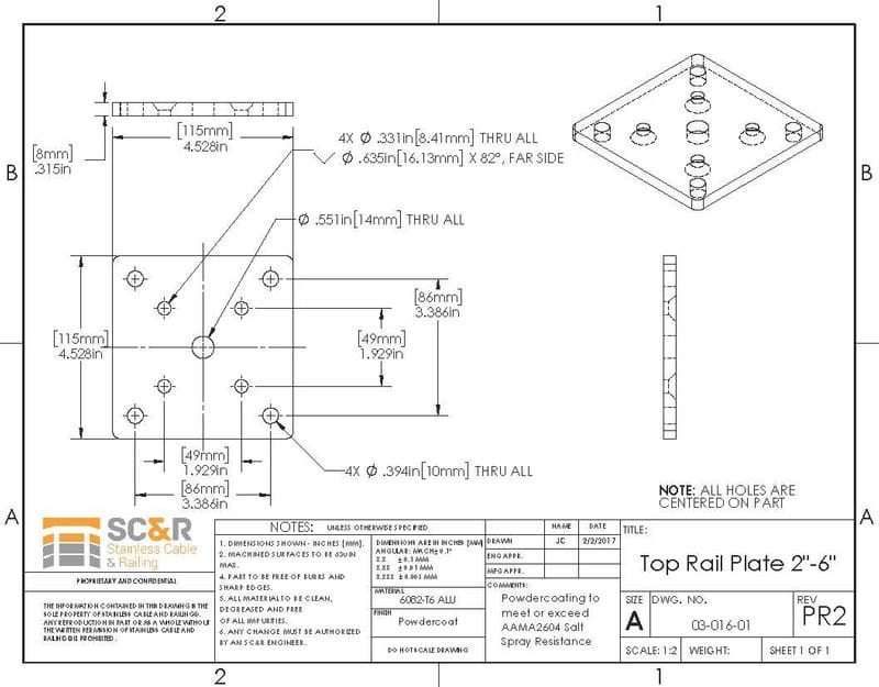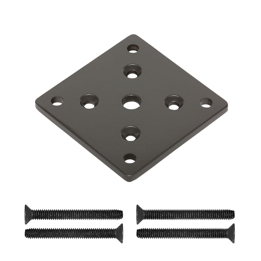 This base plate assembly attaches our Aluminum Posts to a 2×6 Wood Top Rail. Mounts directly to the top of any of our aluminum posts. Use #14 x 1.25″ Phillips Pan Head Screws to attach plate to wood top rail.