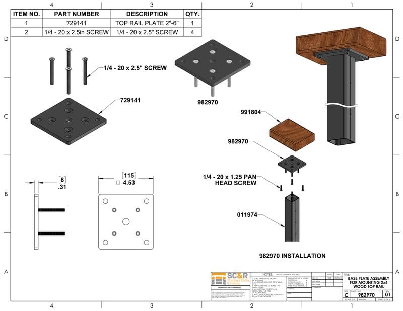 If your wood top rail is only 4″ wide, use our 2×4 Base Plate Assembly instead.