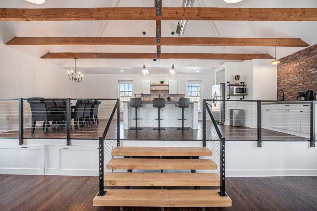 The finished railing now cleanly separates the raised kitchen from the living room without interrupting visibility or natural light. The exposed wood beams and industrial-modern finishes are complemented by the black aluminum supports, and the open-concept design is further enhanced by the stainless cables' low profile.